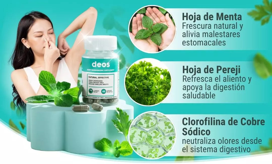🌿 DEOS actúa desde el interior para ayudarte a controlar el mal olor corporal de forma natural, segura y efectiva.